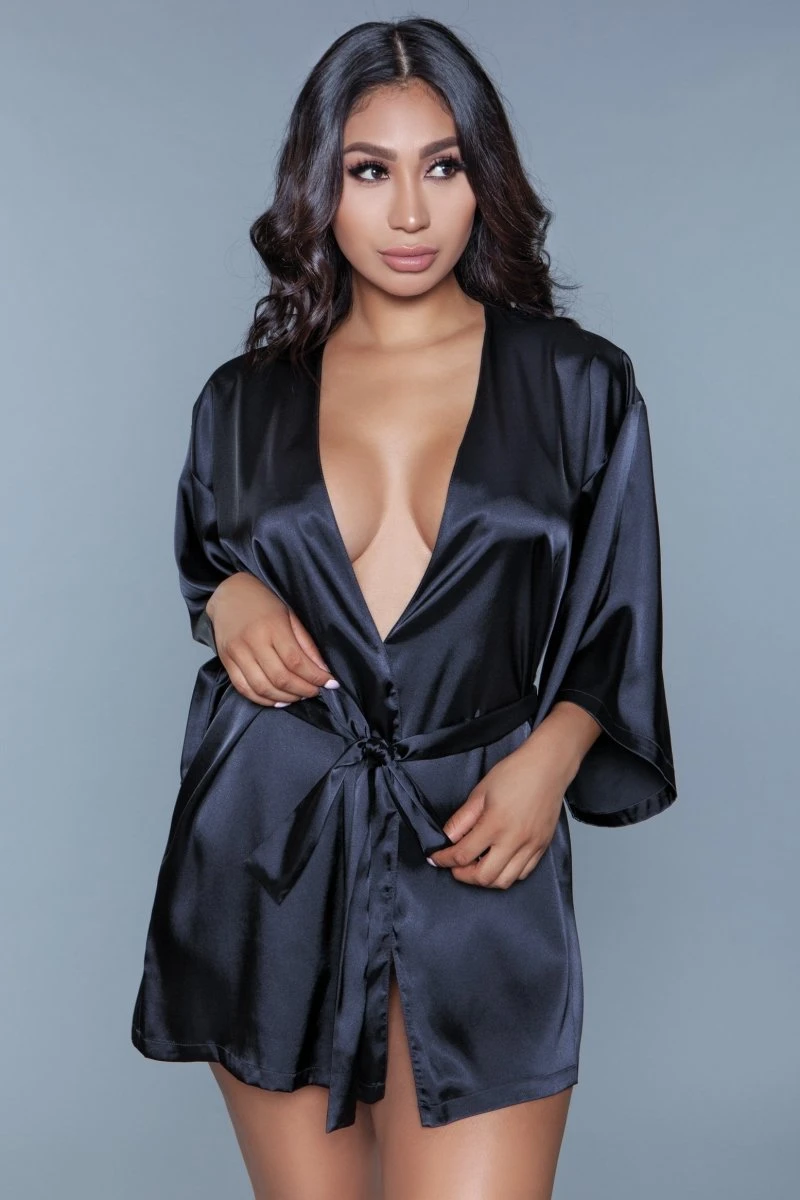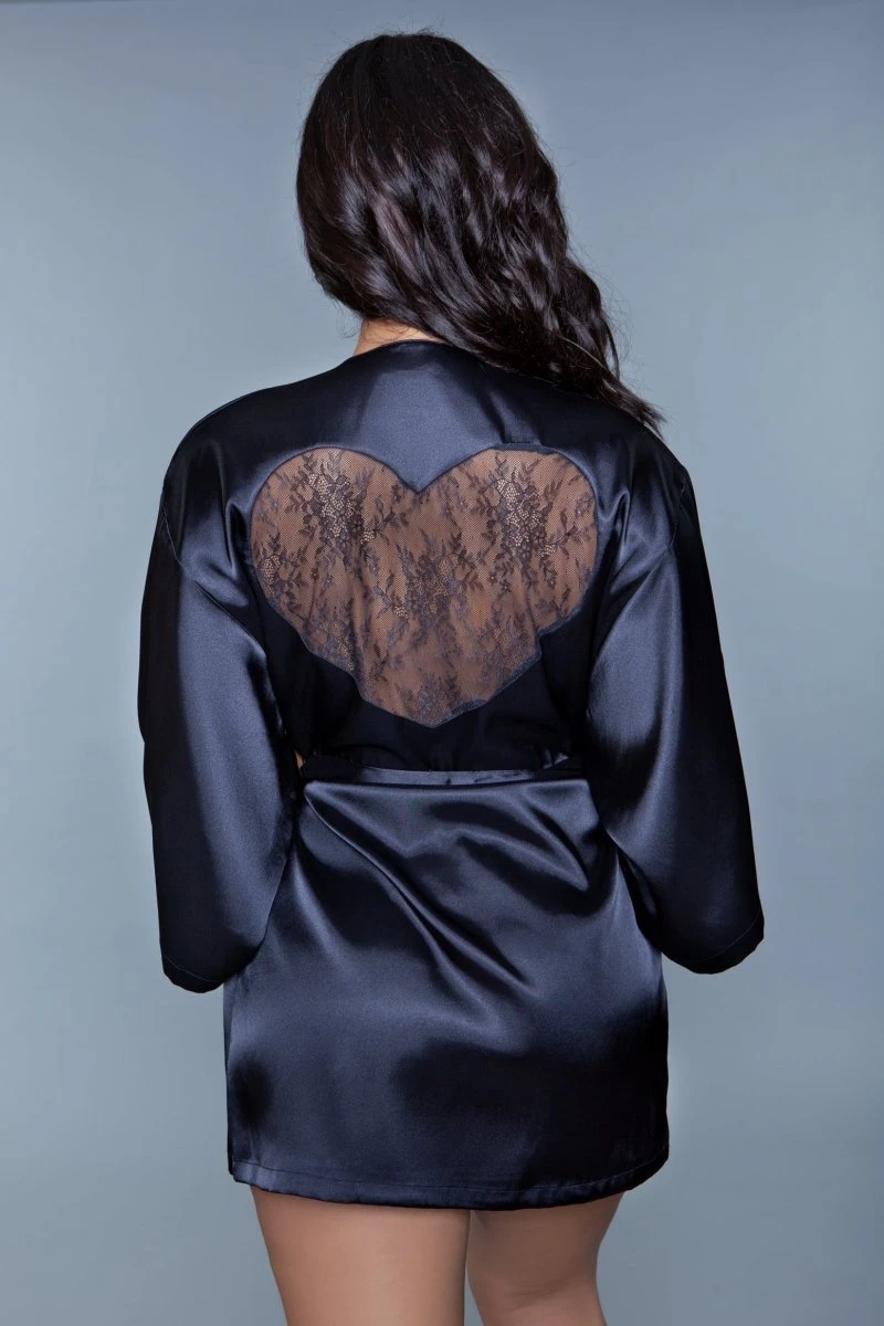 1 Piece. Satin mid-thigh length robe with lace heart detail on the back 3/4 sleeves and Tie sash.