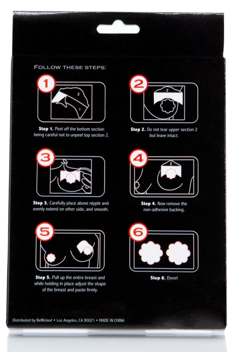 Flower shaped adhesive nipple covers with breast lift adhesive.