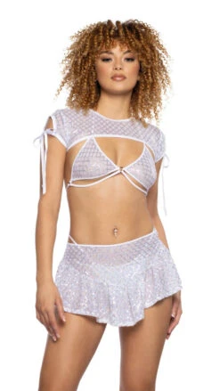 This stunning skirt features stretch sequin mesh fabric, composed of 90% polyester and 10% spandex. (top and shrug sold separately)