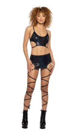 The Metallic Harness Wrap Skirt features attached strings that offer versatile wrapping options. Made from a stretch spandex fabric blend of 85% nylon and 15% spandex, this unique style can be hand washed in cold water. It is proudly made in the USA.