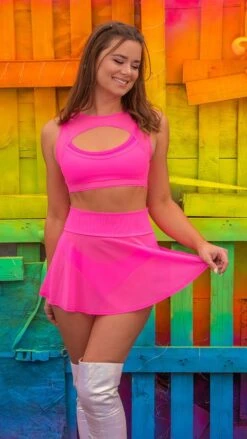 Expertly crafted with a durable blend of stretch mesh fabric, consisting of 85% nylon and 15% spandex, this Neon Mesh Keyhole Top is a must-have addition to your wardrobe. For best results, we recommend hand washing this top with cold water. Proudly made in the USA.