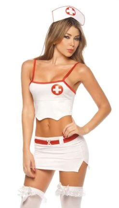 You’re sure to get his blood pumping when you’re dressed for more than mouth to mouth in our sexy new Head Nurse Costume set. This sassy set features a cropped tank top with red cross accent and scallop hemline, side slit mini skirt with contrast belt and matching nurse headpiece.