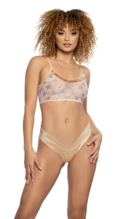 This is a Sequin Star Mesh Ruffle Tank constructed with Stretch Sequin Mesh Fabric consisting of 85% POLYESTER and 15% SPANDEX. It is recommended to wash the garment by hand in cold water. This product was made in the USA.